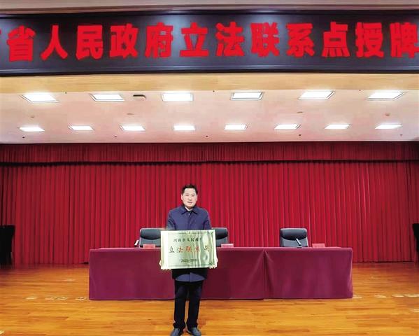 12月12日,河南省人民政府立法联系点授牌仪式在郑州举行。此次省政府确定了行业立法联系点、企业立法联系点、基层立法联系点、高校立法联系点四种类型共80个立法联系点。沈丘县人大常委会是全省26个基层立法联系点中,唯一入选的县级人大常委会。图为授牌仪式现场。 王锋 摄