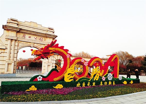 12月25日,周口公园门口新安装的欢度元旦景观小品吸引不少市民观看或拍照。随着2024年新年临近,我市不少文化休闲场所装扮一新,悬挂起红灯笼,营造了浓浓的喜庆氛围。记者 金月全 摄