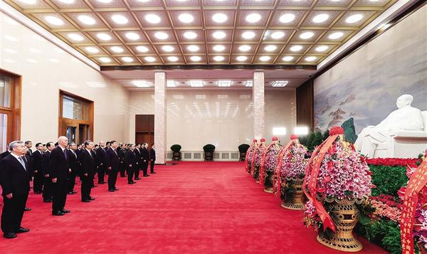 座谈会前,习近平、李强、赵乐际、王沪宁、蔡奇、丁薛祥、李希、韩正等领导同志来到毛主席纪念堂。北大厅内,中共中央,全国人大常委会,国务院,全国政协,中央军委,各民主党派、全国工商联和无党派爱国人士敬献的花篮摆放在毛泽东同志坐像正前方。习近平等向毛泽东同志坐像三鞠躬,随后来到瞻仰厅,瞻仰了毛泽东同志的遗容。