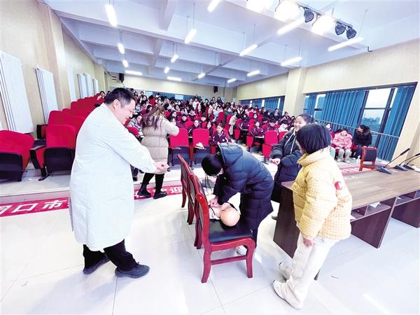 12月18日,周口骨科医院组织创伤骨科、小儿骨科等科室医务人员到周口市实验学校开展“急救知识进校园,生命守护在身边”应急知识专题培训活动。专家为学校师生讲解了烧烫伤、外伤等常见意外伤害的预防和急救方法,并针对海姆立克急救法和心肺复苏急救知识进行了重点培训。 记者 李鹤 摄