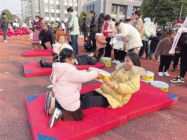 12月28日,淮阳区文正幼儿园举行以“走进游戏、发现儿童”为主题的大型亲子游乐会。本次活动旨在增进亲子感情,培养幼儿的团队意识。图为家长与幼儿做亲子互动小游戏。记者 侯俊豫 通讯员 丁玉霞 摄