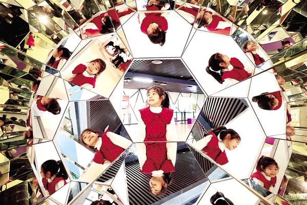 图②为 1月1日,一名小朋友在福建厦门科技馆内体验"钝角六面体镜"。