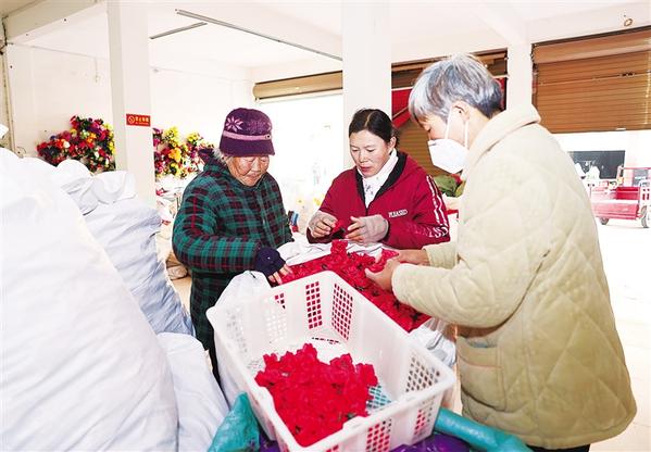 1月4日,汲水镇高王庄巧媳妇王知(中)正忙着为加工点选配原材料,让群众带回家加工。20年前,王知到浙江义乌淘金,慢慢成为骨干技术人员。随着沿海产业向内地转移,王知了解到郸城优越的营商环境,返乡办厂。近年来,郸城县汲水镇实施乡贤回归工程,持续出台激励措施。一大批在外乡贤衔泥归巢,为乡村振兴注入了强大动力。