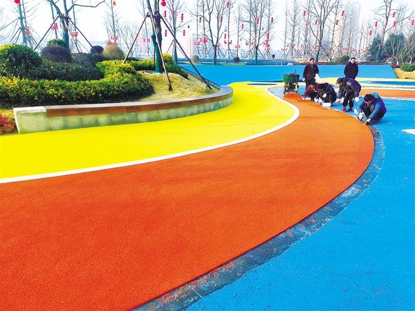 1月5日,八一路沙颍河北岸西侧滨河公园以海洋图案为主题的儿童乐园雏形初现。据了解,该乐园图案施工约2000平米,预计再有10天工期即可交付使用,整个乐园以塑胶为基料,能有效保护孩子安全。 记者 沈湛 摄