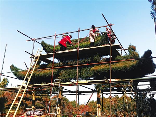 1月7日,在淮阳太昊陵景区独秀园内,园艺工人正在为松拍造型剪枝。独秀园松柏造型是闻名全国园艺界的一枝奇葩,用松柏组合修剪的亭台牌坊、花鸟动物等惟妙惟肖,而冬季剪枝是每年的“必修课”。今冬景区管理单位共投入40名园艺工人,将历时近两个月时间,对200多个造型及1000多棵松柏树进行剪枝定型。记者 杜欣 摄