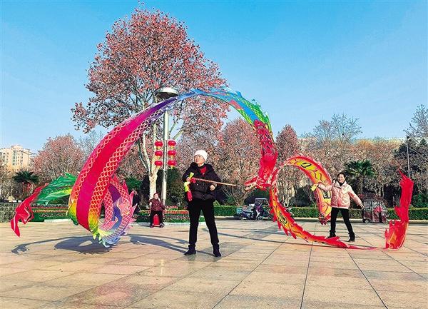 1月7日清晨,川汇区文化广场上两条“手甩龙”和健身者一起舞动,引来群众喝彩。舞龙是一项全身运动,对腰椎、颈椎等都能起到很好的锻炼作用。记者 沈湛 摄