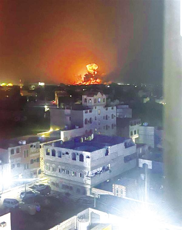 这是1月12日在也门首都萨那拍摄的空袭后的爆炸画面(手机照片)。 据也门萨巴通讯社12日报道,美国和英国的战机在当地时间12日凌晨空袭了也门首都萨那、西部红海城市荷台达和北部萨达省内的多处目标。 新华社发