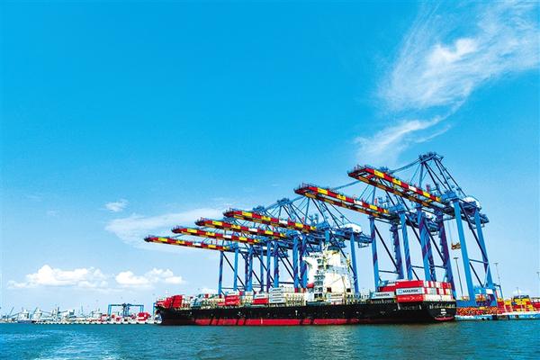 1月10日,一艘货轮在科特迪瓦阿比让港口扩建项目码头装卸集装箱。 由中国港湾工程有限责任公司承建的阿比让港口扩建项目于2015年启动建设,2020年竣工并正式投入使用。项目的建成大幅提升了阿比让港的吞吐量,促进当地经济社会发展。新华社记者 韩旭 摄