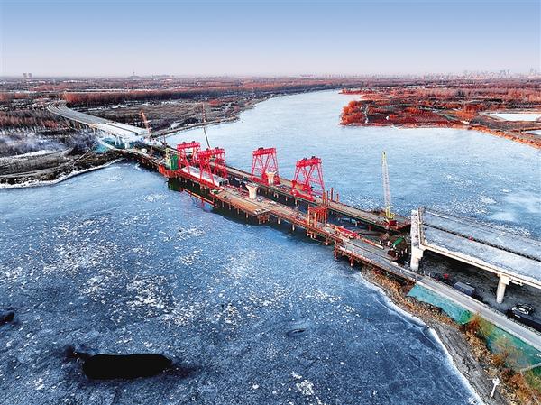 1月15日拍摄的建设中的厂通路潮白河大桥(无人机照片)。