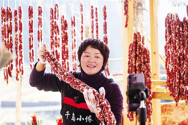 随着春节临近,浙江省杭州市淳安县的特色生态农产品迎来销售旺季,各式农特产变身“年货大礼包”热销节日市场。其中,火腿、风干肉、腊肠、咸鸡、酱鸭等特色农产品尤其受欢迎。