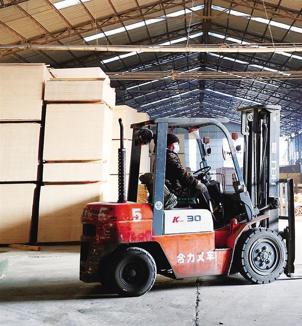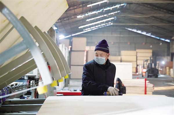 淮阳区刘振屯镇紫荆台村借助林业资源优势,从最初几家木材旋切加工厂开始,逐渐发展成立了40多家板材加工企业,产品远销广东、浙江、四川等地,安置1000余人就业,年产值近4亿元。图为1月12日,该村一板材加工企业工人正在车间内忙碌。