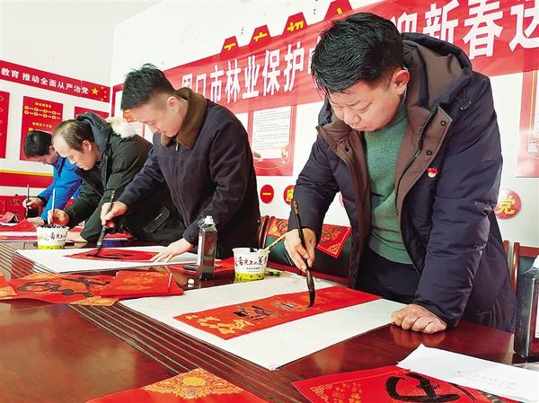 1月18日,中国传统节日腊八节,市林业保护中心驻扶沟县吕潭乡林湾村第一书记何楠邀请部分省、市级书法会员一起到村内开展“迎新春 写春联 送福字 ”活动。活动现场,书法家们挥毫泼墨,热情满满, 寓意吉祥、书体雄健洒脱的春联从笔尖流出。何楠说,能为群众写春联是一件非常有意义的事情,他希望发挥自己的所长,让群众过一个幸福温暖的春节。