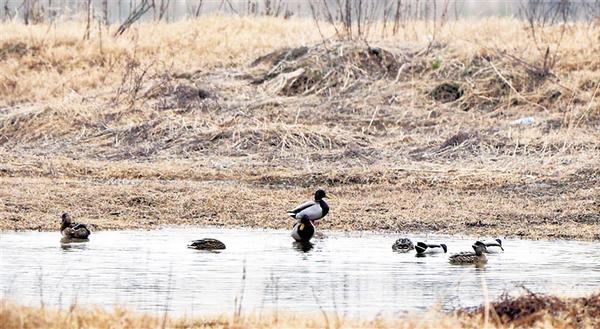 1月8日,西华县自然资源局工作人员在贾鲁河湿地开展越冬水鸟监测工作时,发现绿头鸭、欧亚喜鹊、白鹭、苍鹭、白骨顶等水鸟15种近500只。图为水鸟在河边嬉戏。 记者 张猛 孙靖 通讯员 汪浩 摄