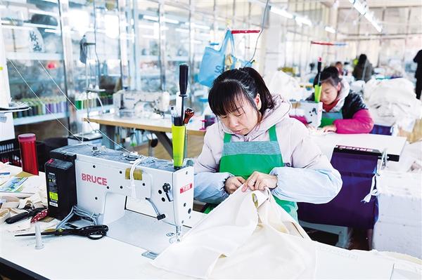 1月17日,在位于淳安县浪川乡的芸卉服饰共富工坊内,工人们在加工服装。
