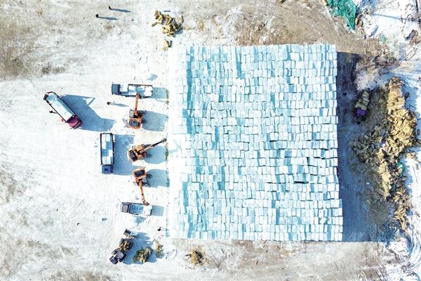 1月19日,工人操控机械在哈尔滨冰雪大世界存冰场码放冰垛(无人机照片)。眼下,哈尔滨冰雪大世界的存冰工作正紧张进行。工人先在冰封的松花江江面上找到合适的采冰区域,使用专业工具将冰切割下来,再由运冰车将每块重达数百斤的冰运往存冰场。大型机械将冰块堆放成整齐的冰垛储存,为下一个冰雪季做准备。新华社记者 谢剑飞 摄