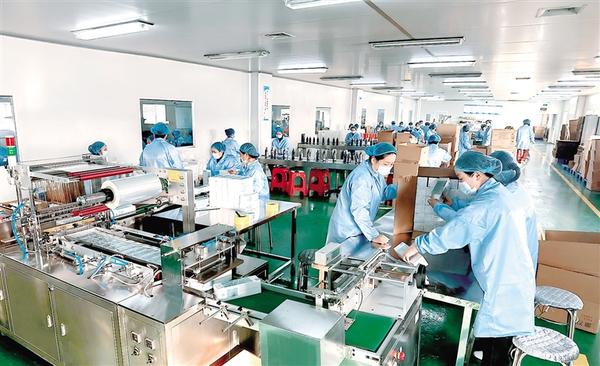 鹿邑县百草园(河南)中药有限公司中草药提取产业基地建设项目已建成投产。该基地引进中草药萃取、中药化妆品、中药日用品、功能性食品等全自动生产线20多条,预计年产值30亿元,利税7.5亿元,安排就业800余人,将带动全县种植中草药15万亩。图为1月24日,该基地包装流水线上的工人将刚生产出来的中草药日用品打包装箱。 记者 王映 摄