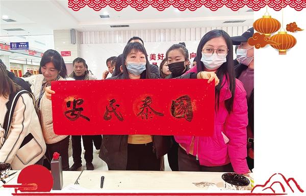 1月25日上午,扶沟县政务服务中心服务大厅,来自扶沟县文联的4名书法家,现场为前来办事的群众和扶沟县政务服务中心干部职工写春联、送祝福,免费送出春联300多副、“福”字200多个、剪纸艺术品100多个。图为群众展示春联横幅。记者 金月全 通讯员 纪俊辉 摄