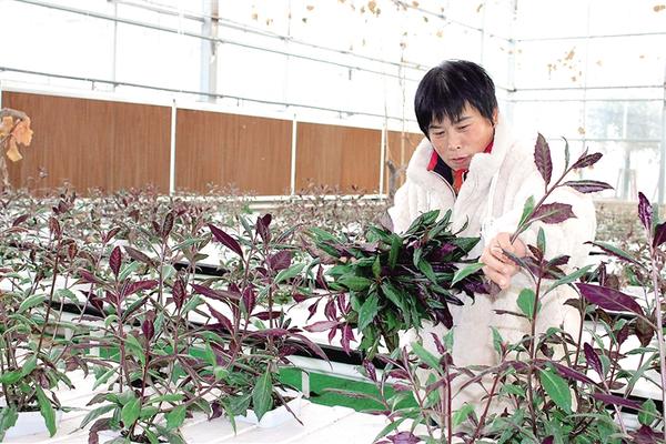 近日,记者在太康县紫薇柿界智慧农业馆看到,这里种植有大量铁皮石斛、霍山石斛、紫背天葵。据介绍,这些植物不仅具有观赏价值,还具有经济价值,可以制作成人们日常饮用的茶品进行售卖。图为工作人员采摘紫背天葵。