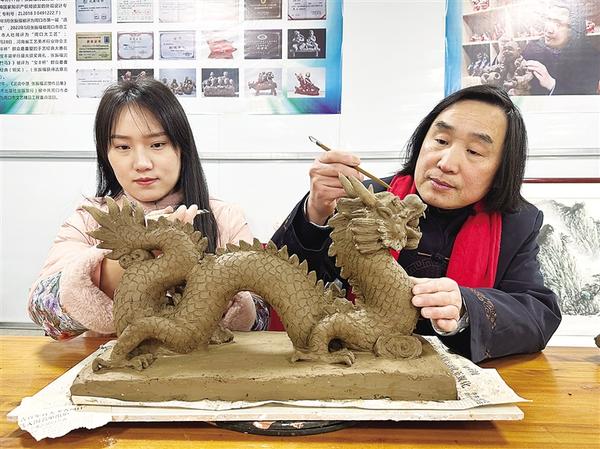 春节将至,郸城县张振福、张玉萍父女俩合作雕刻黄河泥塑《龙腾盛世》组雕作品,作品由4条腾龙、12朵祥云组成,寓意吉祥,表达了张振福父女二人对人民幸福、祖国腾飞的赞美。记者 徐松 摄