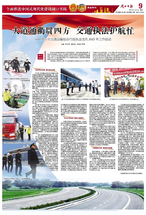 寒来暑往,四季坚守。周口市交通运输综合行政执法支队(以下简称市交通执法支队)就是这样一个甘于奉献、勇于担当的执法集体。他们突出行业担当,守道护路,担责于身,不负使命,为交通运输事业保驾护航,不断推动执法改革向纵深发展,保障全市交通运输事业高质量发展。特别是2023年,该支队重点关注人民群众最关心的问题,聚焦年度重点工作,高效统筹交通执法各项工作,加强道路运输市场执法监管,强化涉路违法行为查处,持续优化交通运输领域营商环境,取得了良好成效。