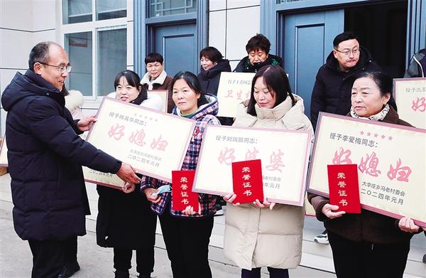 1月31日,扶沟县大李庄乡冯老村表彰25名“乡村光荣榜”典型人物、“学习强国”学习标兵和卫生文明户。图为河南农业大学驻该村第一书记李坤为获奖者颁奖。记者 金月全 通讯员 黄金峰 摄
