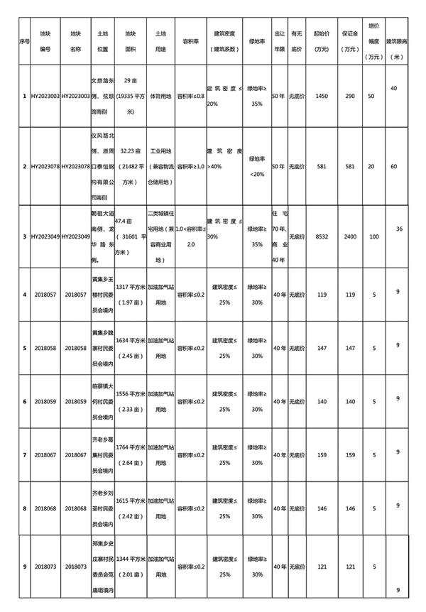 拍卖报价时间:HY2023003地块: 2024年2月29日9时;HY2023078地块: 2024年2月 29日9时10分;HY2023049地块: 2024年2月29日9时20分;2018057地块: 2024年2月29日9时30分;2018058地块: 2024年2月29日9时40分;20218059地块: 2024年2月29日9时50分;2018067地块: 2024年2月29日10时;2018068地块: 2024年2月29日10时10分;2018073地块: 2024年2月29日10时20分。