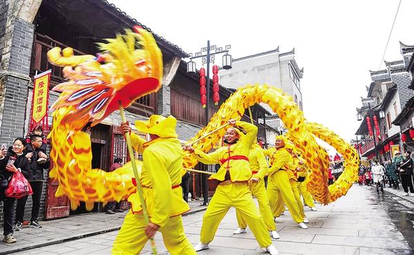 2月7日,参演人员在江西省樟树市临江镇进行舞龙等民俗文化巡演活动。