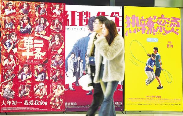 2月17日,在沈阳一家影院,观众从海报前经过。
