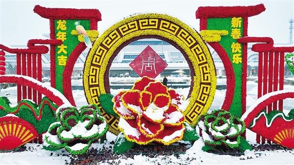 2月20日,周口中心城区普降春雪。高铁周口东站站前广场上雪花飞舞,虽然喜庆的年味配上飘舞的雪花别有一番风味,但给群众出行带来了不便。 记者 姬慧洋 摄