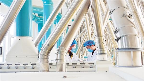 精选、配麦、研磨、筛理、提取,一排排机器在电脑控制下正有序运转,经过多道工序后,一粒粒小麦变成一袋袋优质面粉。再经过两秒钟,一袋10公斤的面粉完成自动挂袋、填充和封装。