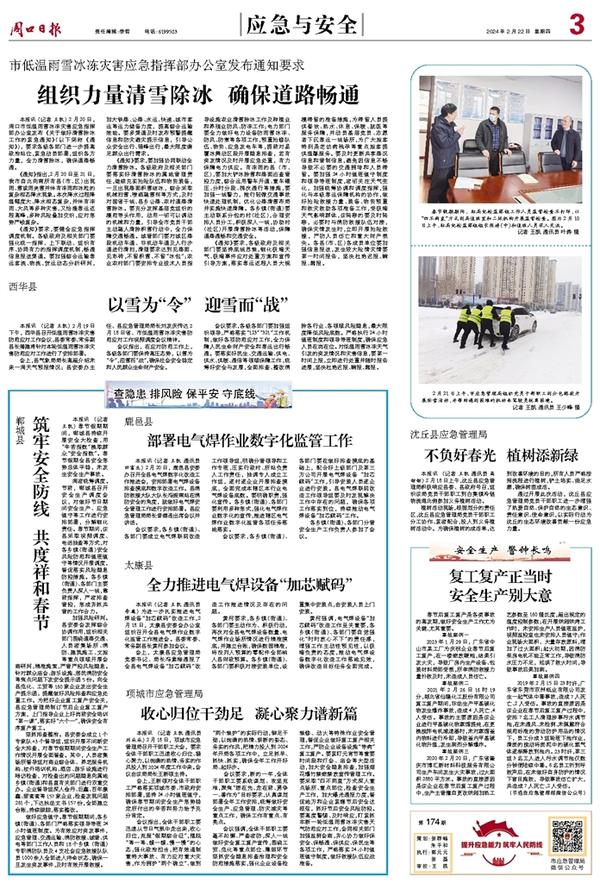 本报讯 (记者 王凯) 2月20日,周口市低温雨雪冰冻灾害应急指挥部办公室发布《关于做好清雪除冰工作的紧急通知》(以下简称《通知》),要求各级各部门进一步提高政治站位,紧急动员部署,组织各方力量,全力清雪除冰,确保道路畅通。
