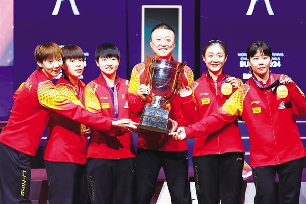 2月24日,冠军中国队在颁奖仪式上合影。当日,在韩国釜山进行的2024年国际乒联釜山世界乒乓球团体锦标赛女子团体决赛中,中国队3比2战胜日本队,获得冠军。