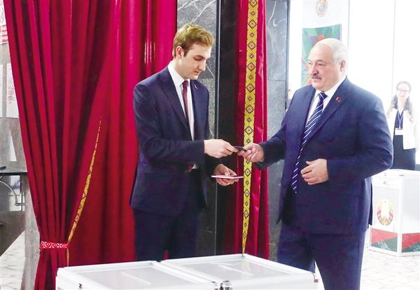 2月25日,白俄罗斯总统卢卡申科(前右)与儿子尼古拉·卢卡申科在首都明斯克一处投票站投票。白俄罗斯国民会议代表院选举25日举行。白俄罗斯国民会议(议会)由共和国院(上院)和代表院(下院)组成,每届任期4年。白俄罗斯没有执政党。国民会议选举不按党派而按选区原则分配名额,在白议会中没有固定的议会党团。任科夫 摄(新华社发)