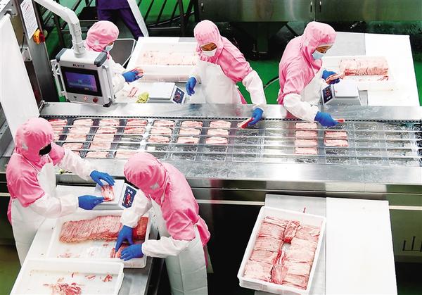 2月26日,在鹿邑县开发区的澄明食品有限公司生产车间内 ,员工正忙碌在生产线上。该公司采用自动化生产技术,日产能500多吨,生产线数据采集率和自控化率达100%。 记者 沈湛 摄