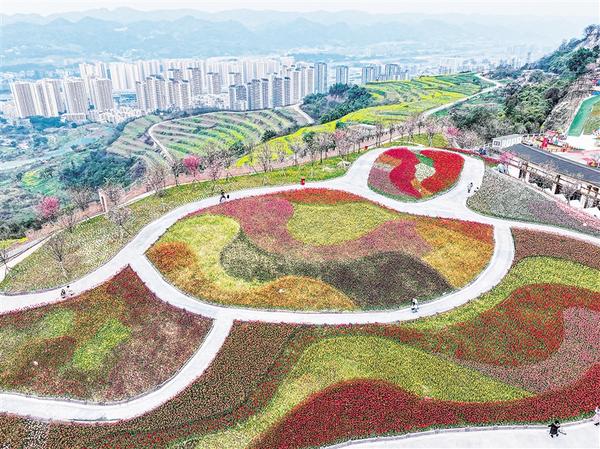 近日,随着气温回升,位于重庆市大渡口区云上田园景区的郁金香竞相绽放,吸引了众多游客前往踏春游玩。