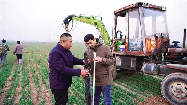 鹿邑县农民杨旗数十年如一日潜心研究节水灌溉技术,被当地群众称作“土专家”。如今,他发明的地埋式伸缩灌溉设备在全省高标准农田建设中被广泛应用。图为杨旗指导工人安装节水灌溉设备。 记者 侯国防 通讯员 郭恒禹 摄
