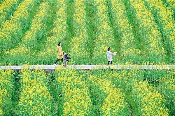 3月2日,游客在油菜花海中赏花游玩。近日,位于重庆市大足区拾万镇长虹村隆平五彩田园的300亩油菜花迎来盛开季,花海在大地上展开一幅绚丽的田园画卷,吸引游客前来观赏拍照。