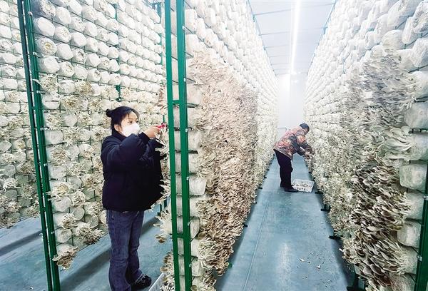 沈丘县纸店镇现代农业产业园,占地200余亩,总投资3.4亿元,主要产品有秀珍菇、猪肚菇、鹿茸菇、果味菇、黑皮鸡枞、绣球菌等。这里年制菌种240万公斤,年制菌包6000万包,年产食用菌鲜品2.5万吨,年产菇源食品1000吨,年产值5亿元,安置就业300余人,带动就业800余人。图为工人在采摘头茬秀珍菌。 记者 王映 摄