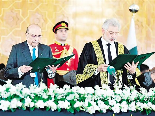 3月10日,在巴基斯坦伊斯兰堡总统府,巴基斯坦最高法院首席大法官卡齐·法伊兹·伊萨(右)主持当选总统阿西夫·阿里·扎尔达里的宣誓就职仪式。巴基斯坦当选总统阿西夫·阿里·扎尔达里10日下午在巴首都伊斯兰堡总统府宣誓就职。 新华社发