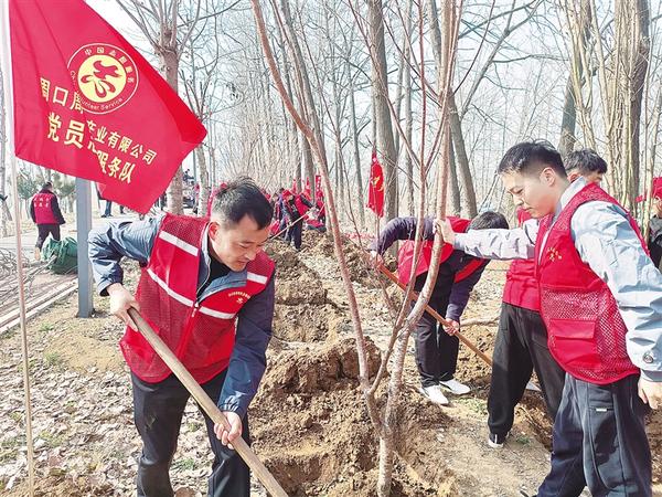 三月春光好,植绿正当时。连日来,川汇区掀起全民义务植树热潮,全区干群用实际行动为家园增添新绿。图为3月12日上午,区新时代文明实践中心联合区消防救援大队、大铁牛巾帼志愿者联合会等到沙河湾湿地公园开展“植树添新绿、共创文明城”主题活动。