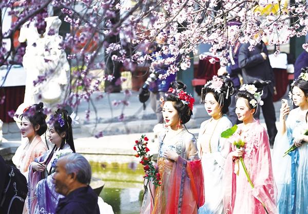 3月15日,演艺人员身着汉服在天津桃花堤漫步。当日,第33届天津运河桃花文化商贸旅游节开幕式在红桥区举行。位于天津红桥北运河畔的桃花堤桃花初绽,人们三五成群地漫步其中,欣赏春日美景。 新华社记者 李然 摄