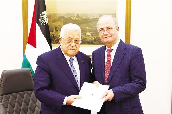 3月14日,在约旦河西岸城市拉姆安拉,巴勒斯坦总统阿巴斯(左)将授权书交到穆罕默德·穆斯塔法手中。 据巴勒斯坦通讯社14日报道,巴总统阿巴斯当天授权穆罕默德·穆斯塔法组建新一届政府。巴勒斯坦总统办公室供图(新华社发)