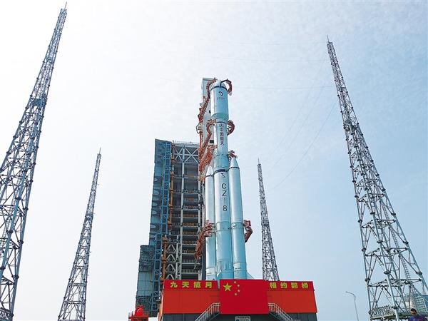 3月17日,探月工程四期鹊桥二号中继星和长征八号遥三运载火箭组合体在垂直转运中。
