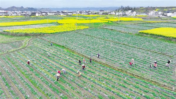 3月18日,村民在贵州省黔东南苗族侗族自治州黄平县旧州镇大碾房村田间劳作(无人机照片)。春分将至,各地农民抢抓农时开展农事活动。 新华社发 王超 摄