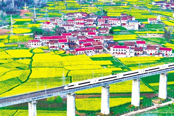 3月20日,西成高铁线上的列车驶过汉中市南郑区阳春镇(无人机照片)。 眼下,陕西汉中市百万亩油菜花竞相绽放,西成高铁线上,一趟趟列车穿行在金黄色的油菜花海之中,为秦巴山区勾画出朝气蓬勃的春日景象。新华社记者 邵瑞 摄