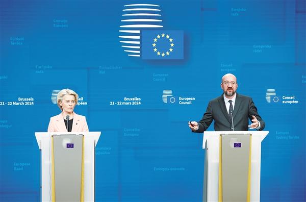 3月21日,在比利时布鲁塞尔,欧洲理事会主席米歇尔(右)、欧盟委员会主席冯德莱恩在欧盟峰会期间出席新闻发布会。 欧洲理事会主席米歇尔21日宣布,欧洲理事会当天决定启动波黑加入欧盟的谈判。新华社记者 赵丁喆 摄
