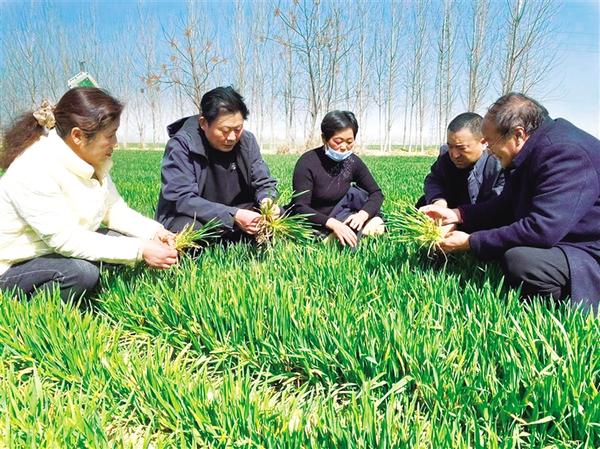 近日,扶沟县科协志愿者联合农技专家深入田间地头,实地查看小麦长势和土壤墒情,指导农户做好小麦病虫害防治管理工作,推动春季农业安全生产落细落实。图为农技专家查看小麦长势。 记者 金月全 通讯员 刘芳 摄