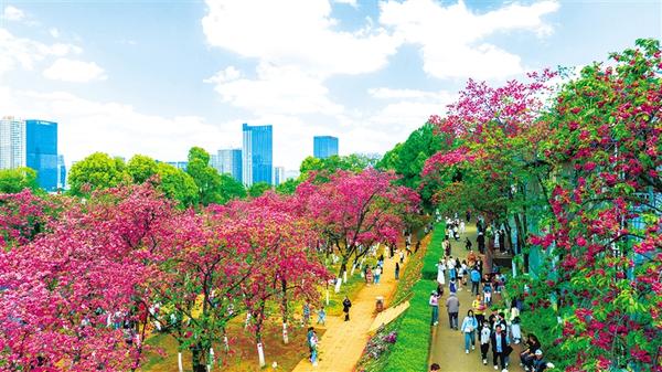 3月24日,游客在昆明圆通山公园观赏樱花(无人机照片)。近日,云南昆明圆通山公园的樱花进入盛花期,吸引众多市民和游客前来观花赏景,乐享春日时光。新华社记者 胡超 摄