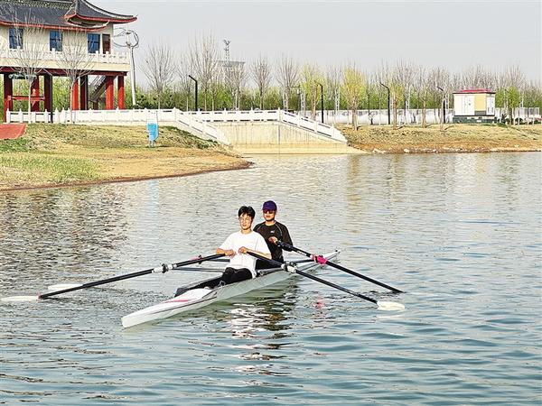 近年来,我市坚持生态优先、绿色发展理念,持续优化中心城区生态环境,依托独特的水域资源,走产城旅融合发展之路。图为3月26日下午,我市赛艇运动员在引黄调蓄项目的水上训练中心进行集训,积极备战今年各项赛事。