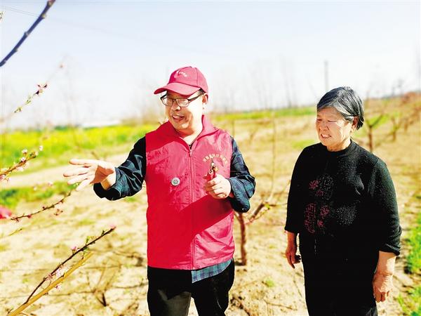 当前正值春季田间管理关键时期,我市200多名省市县三级科技特派员奔赴生产一线,进村巷、到田间,扎实开展科技助农服务,帮助农民解决生产难题。 图为3月31日省科技特派员、市首席科普专家王尚堃(左)在郸城县秋渠乡为果农传授果树管理“真经”。记者 付永奇 摄